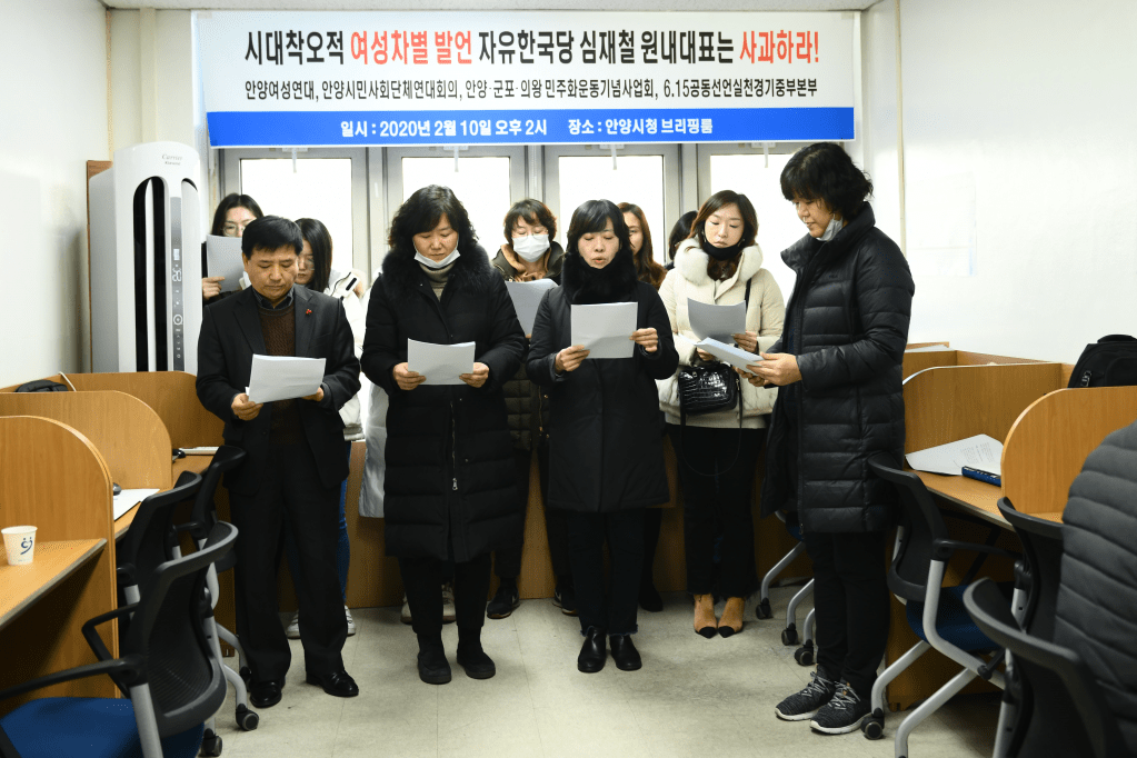 지금이 어떤 시대인가? 미투운동으로 시작된 사회적 성별불균형, 젠더폭력을 근절하기 위한 사회적 목소리가 높아져 가는 이 시대에 시대착오적 발언을 일삼는 사람이 과연 한 당의 원내대표를 맡을 자격이 있는가? 더욱이 안양시 5선 국회의원으로 공식석상에서 한 망언을 안양시민으로써, 여성단체와 시민사회단체로써 용납할 수가 없다.