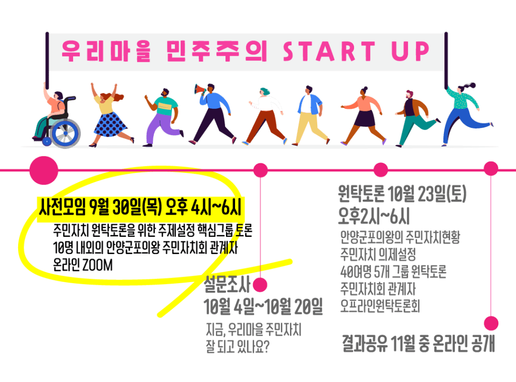 10월 23일 토요일에는 되도록이면 오프라인, 현장모임으로 원탁토론회를 진행하고자 합니다. 각 주민자치회, 주민자치위원회별로 1명씩 참여하실 수 있으면 가장 좋습니다. 내년부터 본격화될 주민자치회의 원활한 준비를 위해 안양군포의왕의 주민자치회, 주민자치위원들의 고른 참여를 기대합니다.