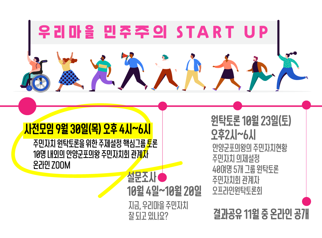 10월 23일 토요일에는 되도록이면 오프라인, 현장모임으로 원탁토론회를 진행하고자 합니다. 각 주민자치회, 주민자치위원회별로 1명씩 참여하실 수 있으면 가장 좋습니다. 내년부터 본격화될 주민자치회의 원활한 준비를 위해 안양군포의왕의 주민자치회, 주민자치위원들의 고른 참여를 기대합니다.