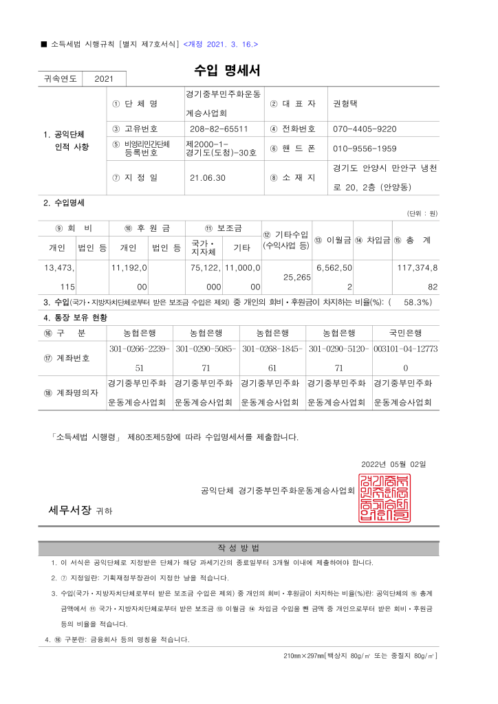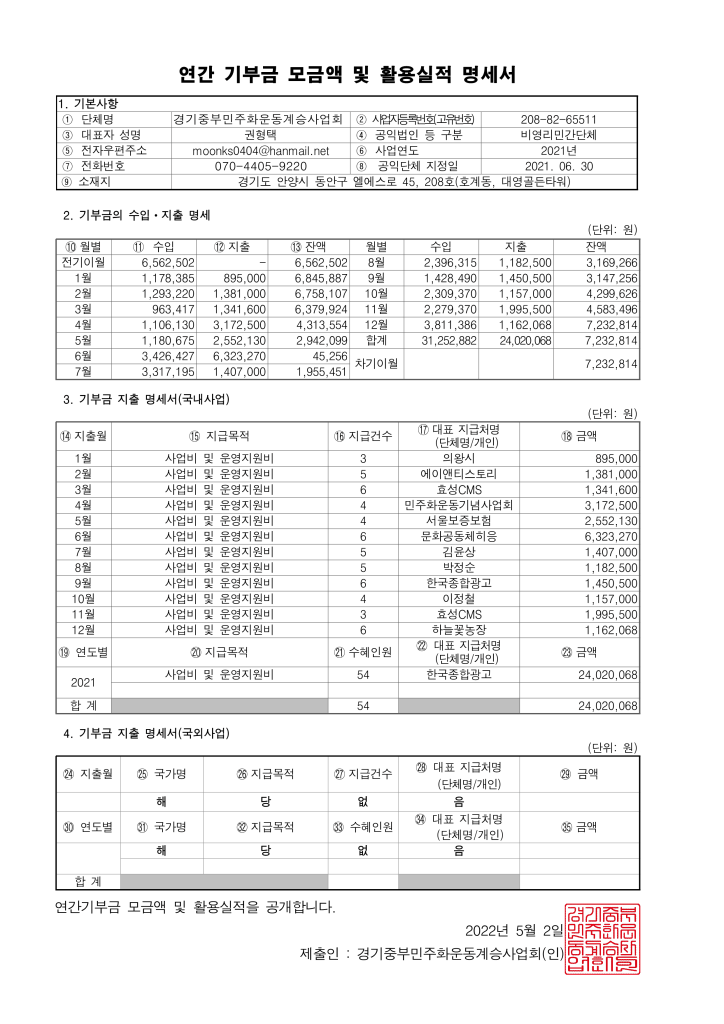 2021 경기중부민주화운동계승사업회 재정보고 allmytown2022년 5월 9일공개자료 글 네비게이션 이전다음 2021년 경기중부민주화운동계승사업회 재정보고 드립니다 2021 수입명세서 다운로드하기 2021 연간기부금모금액 및 활용실적 명세서다운로드하기 2022. 5. 9. 게시 이 글 공유하기: X에 공유 (새 창에서 열림) X Facebook으로 공유하기 (새 창에서 열림) Facebook 좋아하기 가져오는 중... 관련