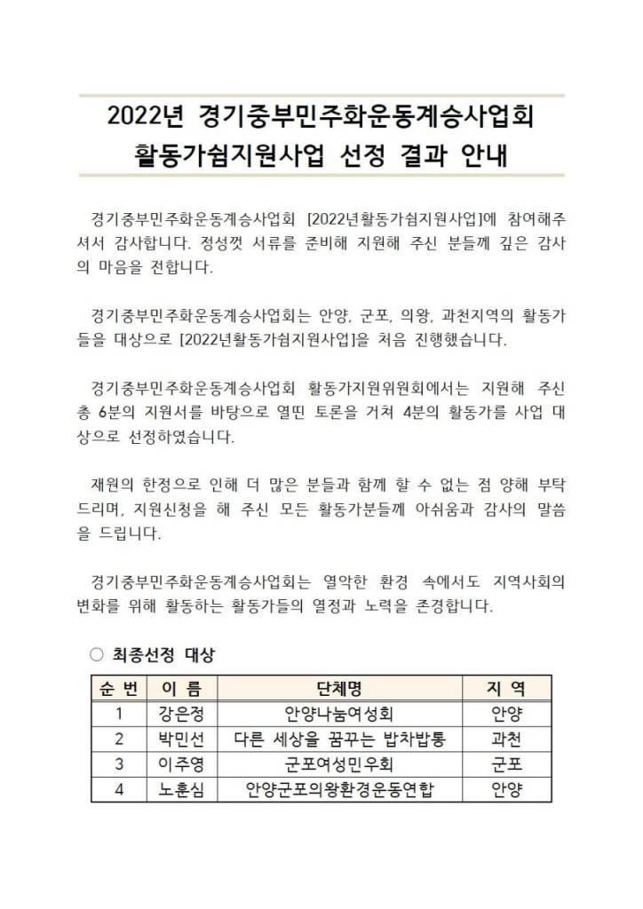 경기중부민주화운동계승사업회 [2022년활동가쉼지원사업]에 참여해주셔서 감사합니다. 정성껏 서류를 준비해 지원해 주신 분들께 깊은 감사의 마음을 전합니다.
