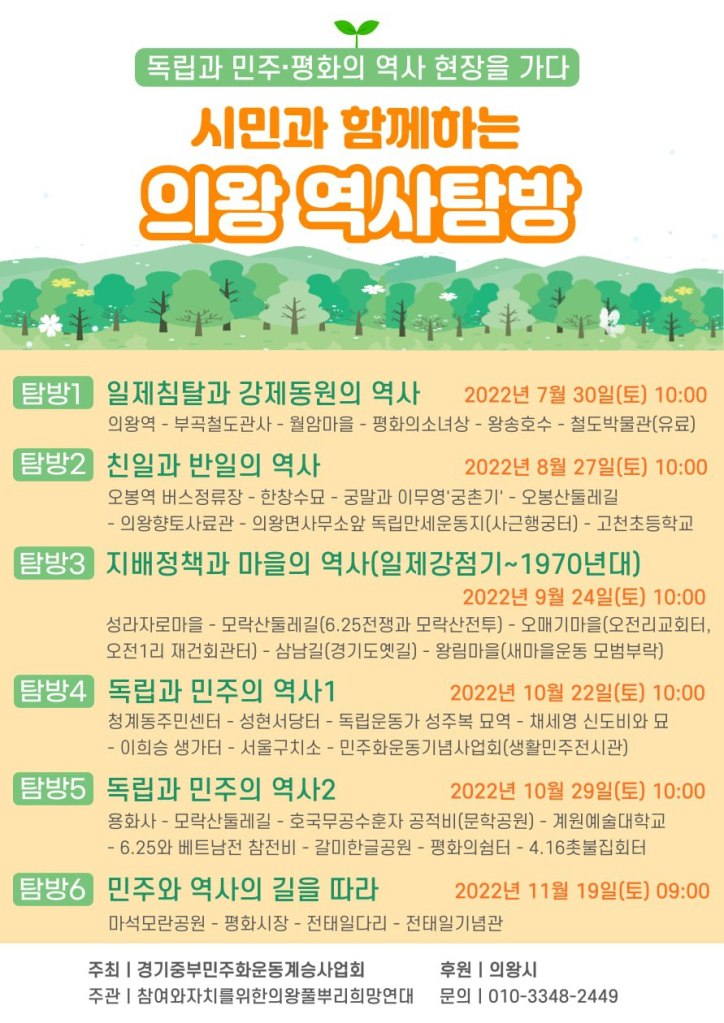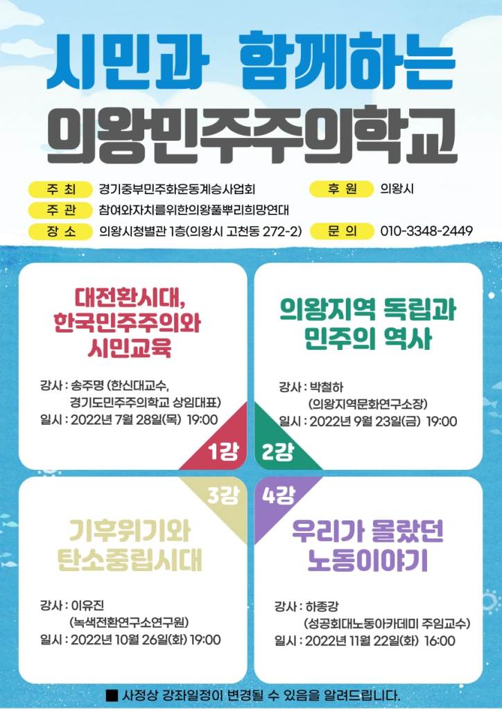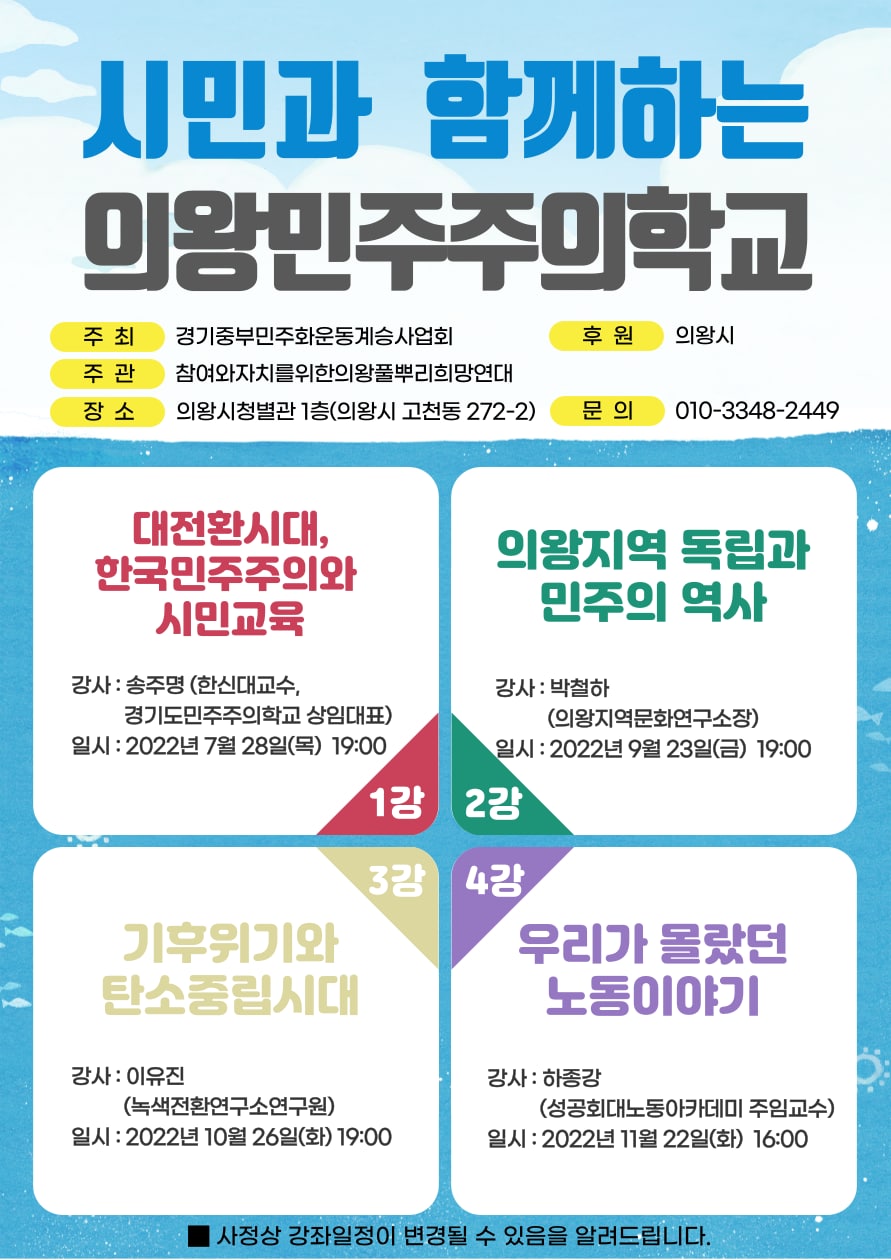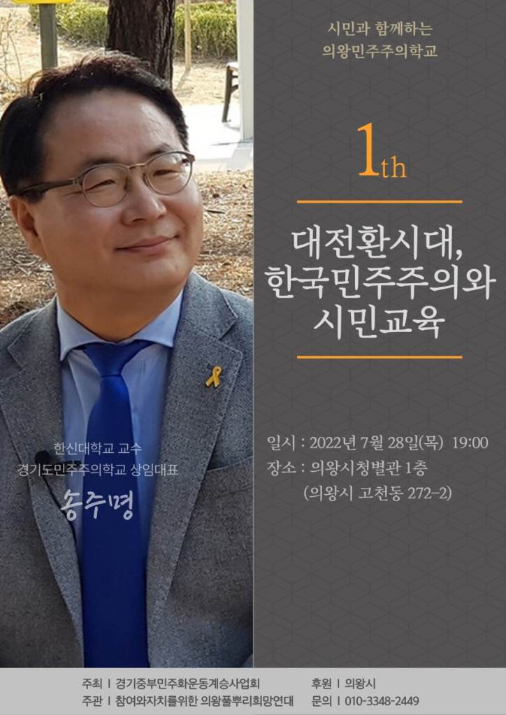 의왕 민주주의학교 allmytown2022년 8월 1일2022년 8월 1일소식 글 네비게이션 이전다음 경기중부민주화운동계승사업회에서는 의왕시의 후원을 받아 시민과 함께 하는 의왕민주주의 학교를 엽니다. 이 글 공유하기: X에 공유 (새 창에서 열림) X Facebook으로 공유하기 (새 창에서 열림) Facebook 좋아하기 가져오는 중... 관련