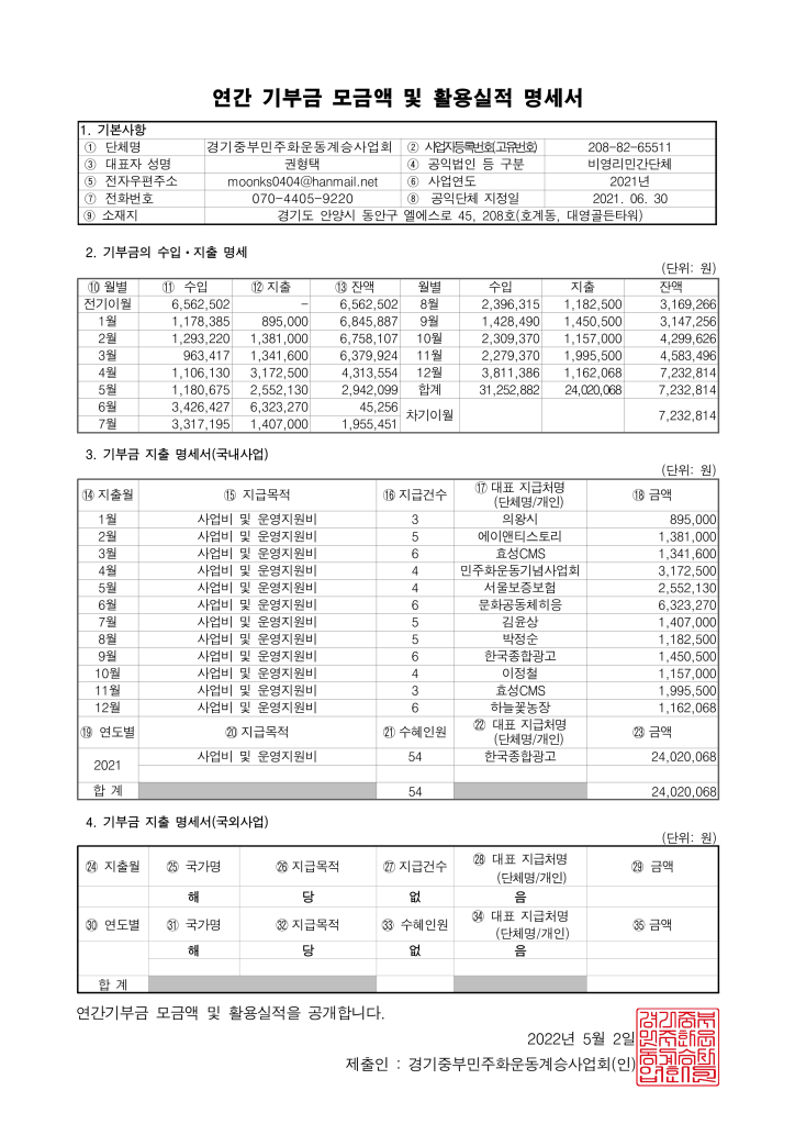 2021 연간 기부금 모금액 및 활용실적 명세서 allmytown2022년 8월 24일2023년 4월 18일공개자료, 소식 글 네비게이션 이전다음 2021년 연간기부금 모금액 및 활용실적 명세서를 공개합니다. 이 글 공유하기: X에 공유 (새 창에서 열림) X Facebook으로 공유하기 (새 창에서 열림) Facebook 좋아하기 가져오는 중... 관련