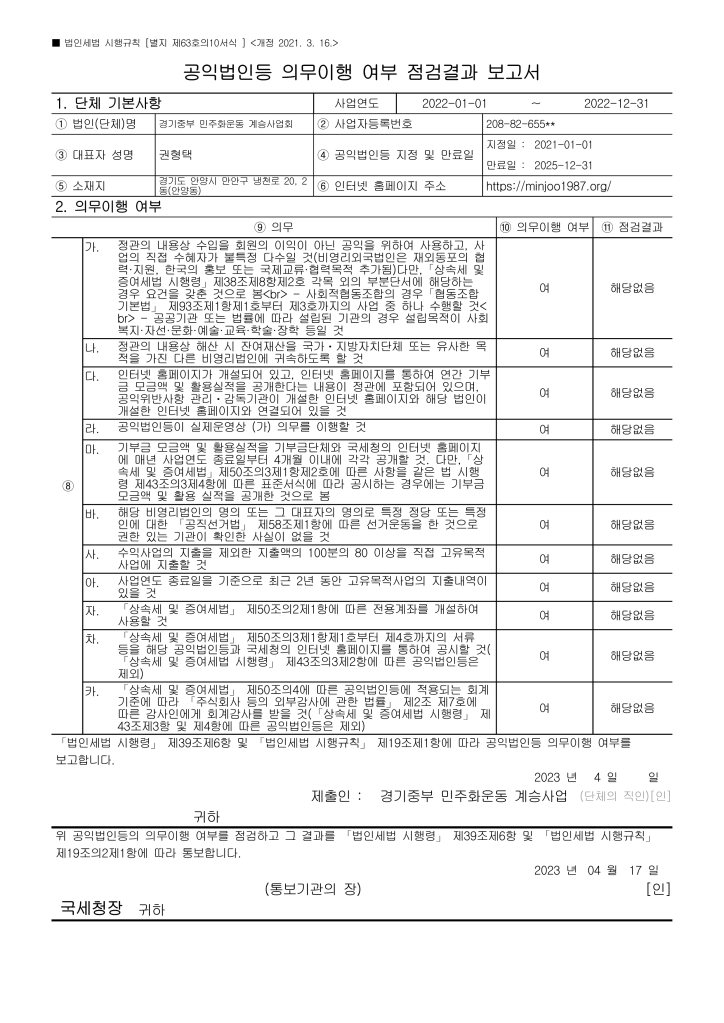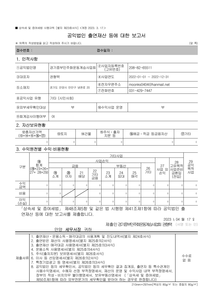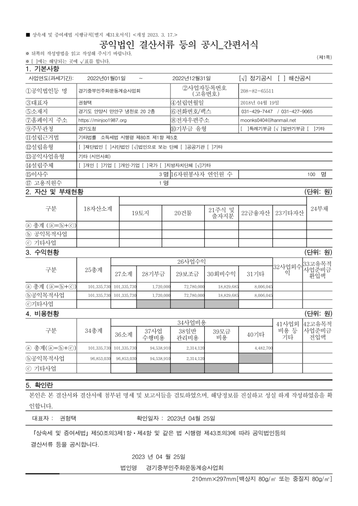 2022년 회계연도 공익법인 결산 관련 공고 allmytown2023년 4월 17일2023년 6월 29일공개자료 글 네비게이션 이전다음 이 글 공유하기: X에 공유 (새 창에서 열림) X Facebook으로 공유하기 (새 창에서 열림) Facebook 좋아하기 가져오는 중... 관련