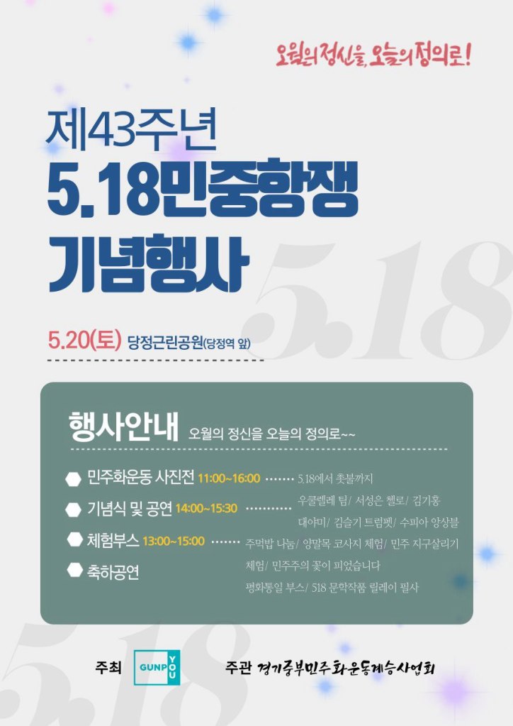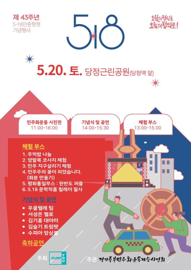 경기중부민주화운동계승사업회는 제43주년 광주민중항쟁기념일을 맞아 군포시 당정근린공원에서 이번 주 토요일 5월 20일에 문화행사을 열고 체험부스를 운영합니다.