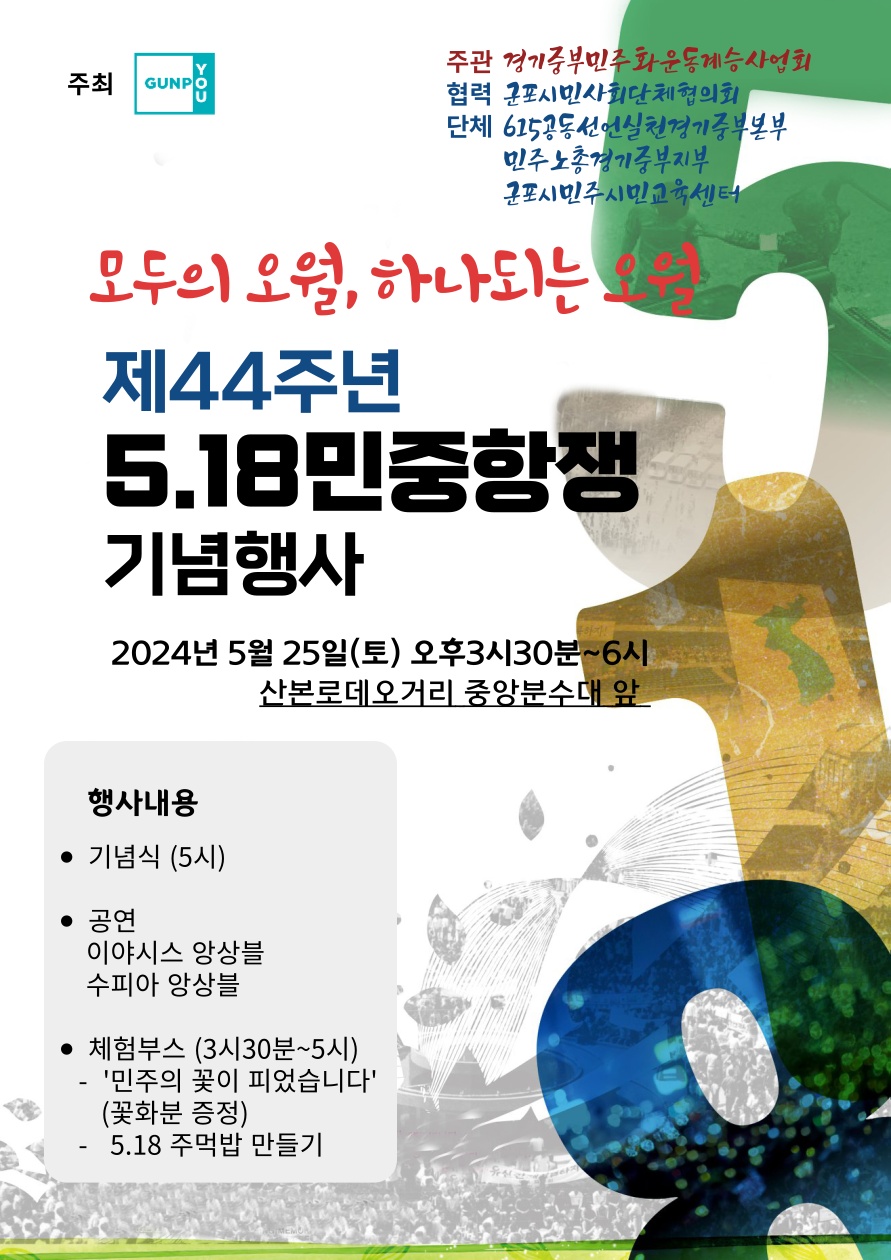 제44주년 5.18민중항쟁 기념행사 allmytown2024년 5월 20일소식 글 네비게이션 이전다음 5월 항쟁을 기념하는 경기중부민주화운동계승사업회에서는 18일 광주 518역사기행에 이어 산본 로데오거리에서 기념행사를 엽니다. 이 글 공유하기: X에 공유 (새 창에서 열림) X Facebook으로 공유하기 (새 창에서 열림) Facebook 좋아하기 가져오는 중... 관련
