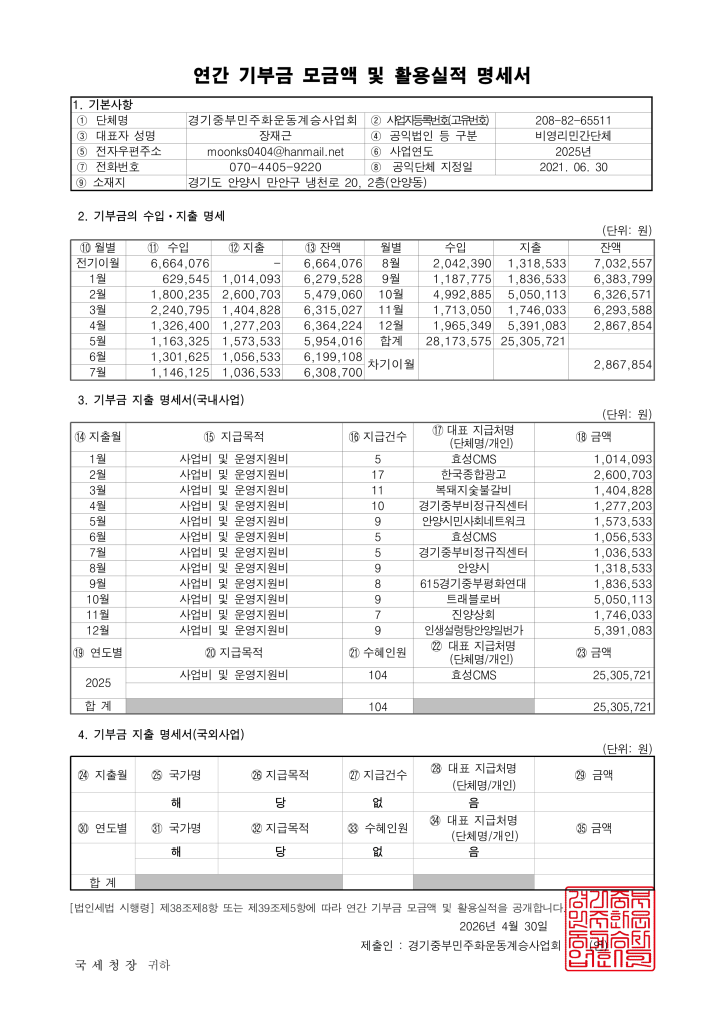 2025년 연간 기부금 모금액 및 활용실적 명세서 allmytown2026년 4월 24일공개자료 글 네비게이션 이전 이 글 공유하기: X에 공유 (새 창에서 열림) X Facebook으로 공유하기 (새 창에서 열림) Facebook 좋아하기 가져오는 중... 관련